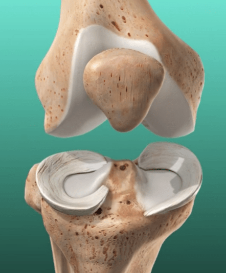 First, here is some background that I learned about our knees. The bottom of each thigh bone (“femur”) has two ball-shaped protrusions.  They sit on top of two corresponding slightly concave sockets at the top of each shin bone (“tibia”), one on the inside (called “medial”) and one on the outside (“lateral”).  The surfaces of each ball and socket are covered with “articular cartilage”, a strong, slippery, Teflon-like tissue that lets the bones glide over one another when moving.  It looks like this: